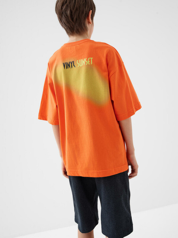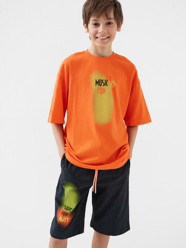 Костюм для мальчика подростка. Состоит из футболки и шорт. Выполнен из хлопкового трикотажа. Футболка оверсайз, с коротким рукавом и ярким принтом. Шорты свободные, с эластичным поясом и шнурком для регулировки посадки. По бокам расположены карманы.