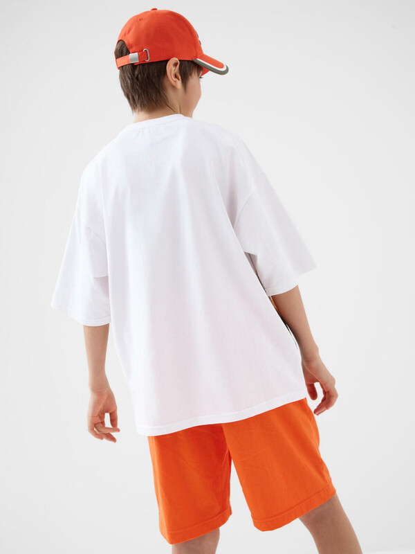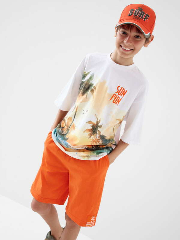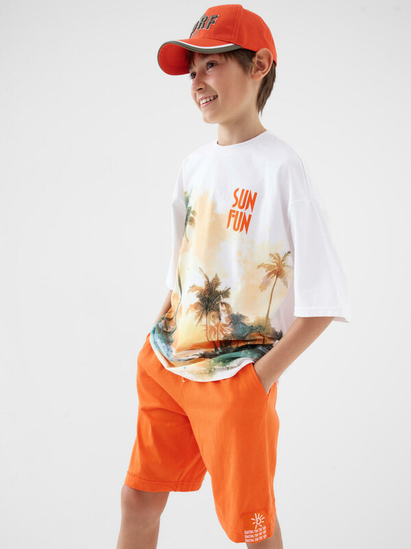 Костюм для мальчика подростка. Состоит из футболки и шорт. Выполнен из хлопкового трикотажа. Футболка оверсайз, с коротким рукавом и ярким принтом. Шорты свободные, с эластичным поясом и шнурком для регулировки посадки. По бокам расположены карманы. Декоративная нашивка.