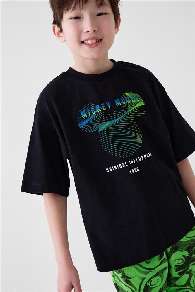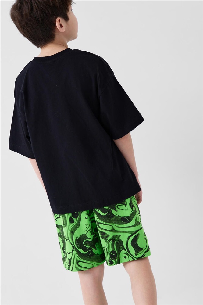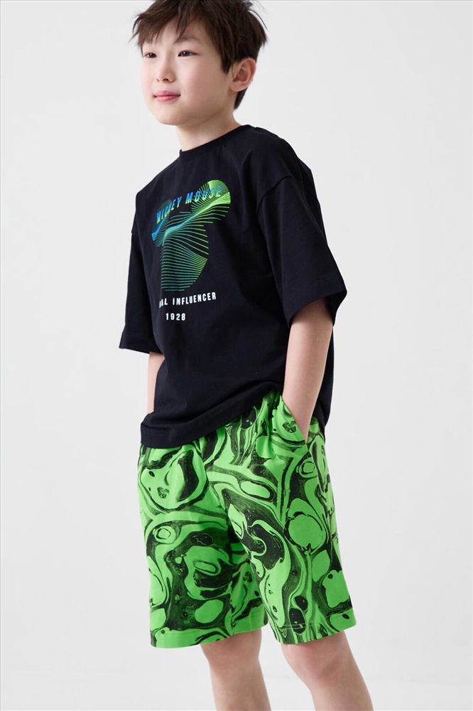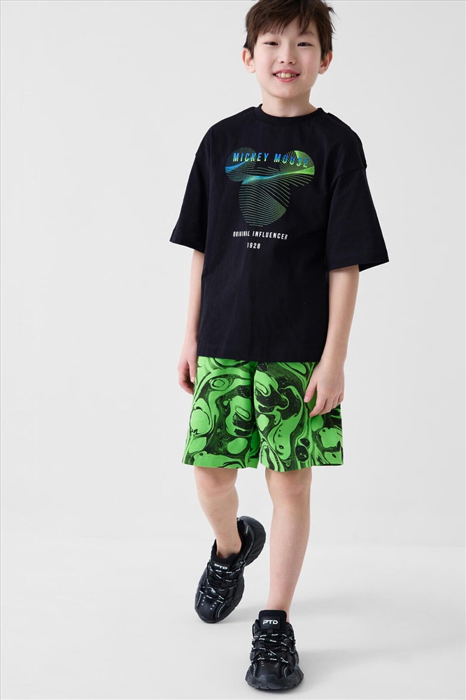 ID товара: 1240427 Состав: 95% хлопок, 5% эластан Сезон: Весна/Лето Пижама с Микки Маусом для мальчика подростка. Материал - хлопковый трикотаж. Футболка оверсайз черного цвета с ярким принтом на груди. Шорты выделяются ярким абстрактным принтом в кислотно-зеленых и черных тонах. Пояс на шортах с резинкой и регулируется шнуром. Удобные боковые карманы добавляют практичности. Можно составить family look cо взрослым вариантом пижамы аналогичного дизайна. Комментарии к товару
