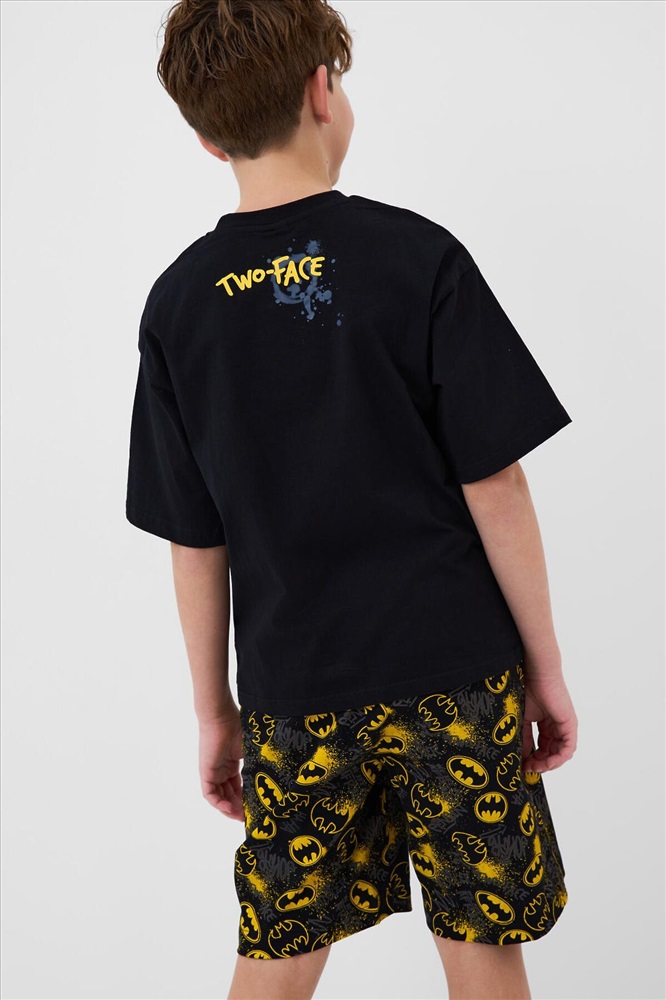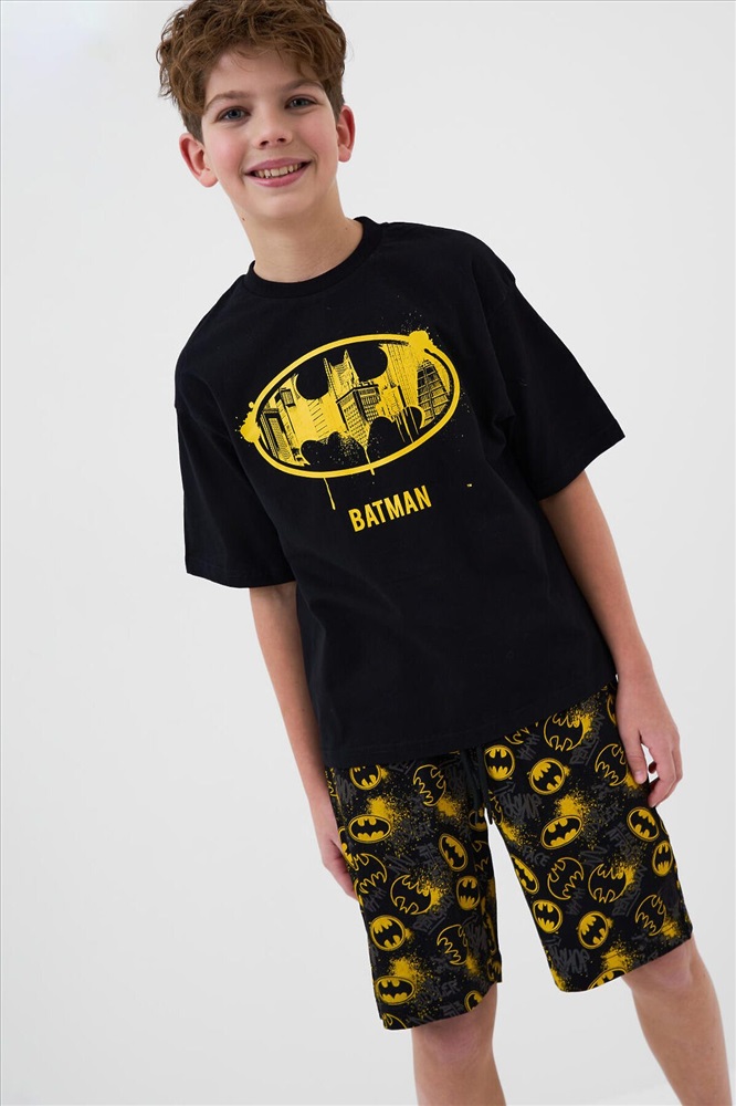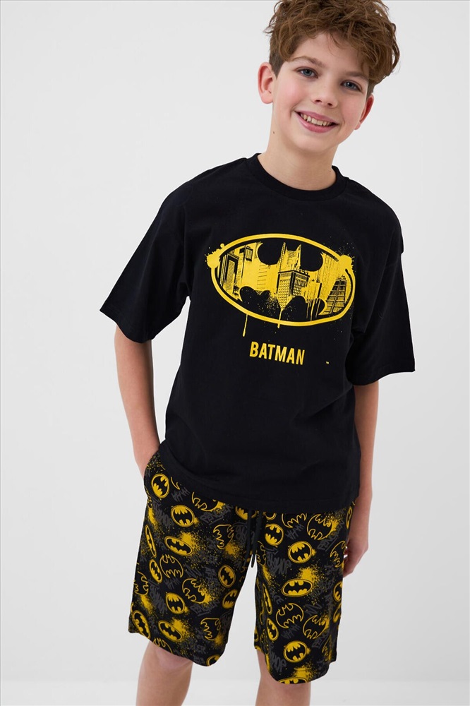 ID товара: 1242083 Состав: 95% хлопок, 5% эластан Сезон: Весна/Лето Рукав: короткие Страна бренда: Германия Страна производства: Китай Пижама для мальчика подростка. Комплект состоит из чёрной оверсайз футболки и шорт. На футболке спереди крупный яркий принт с логотипом Бэтмен. Шорты украшены ярким принтом с логотипами. Шорты средней длины, с удобным эластичным поясом и шнурком для регулировки. Материал - хлопковый, мягкий трикотаж. Комментарии к товару