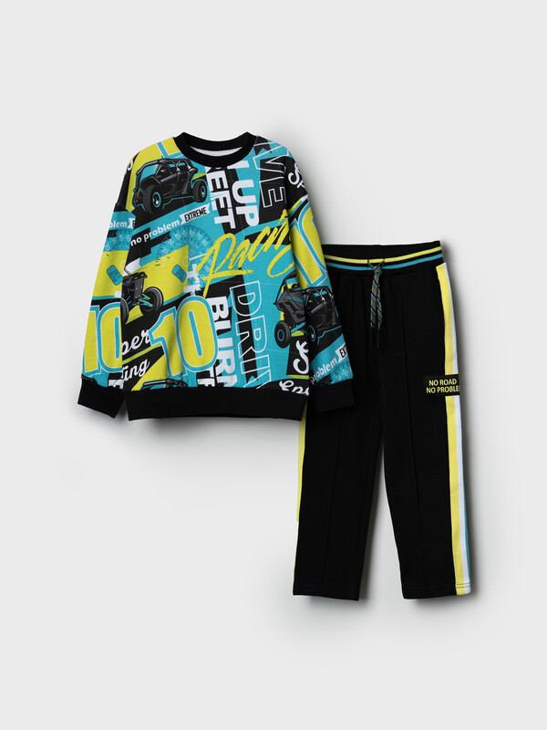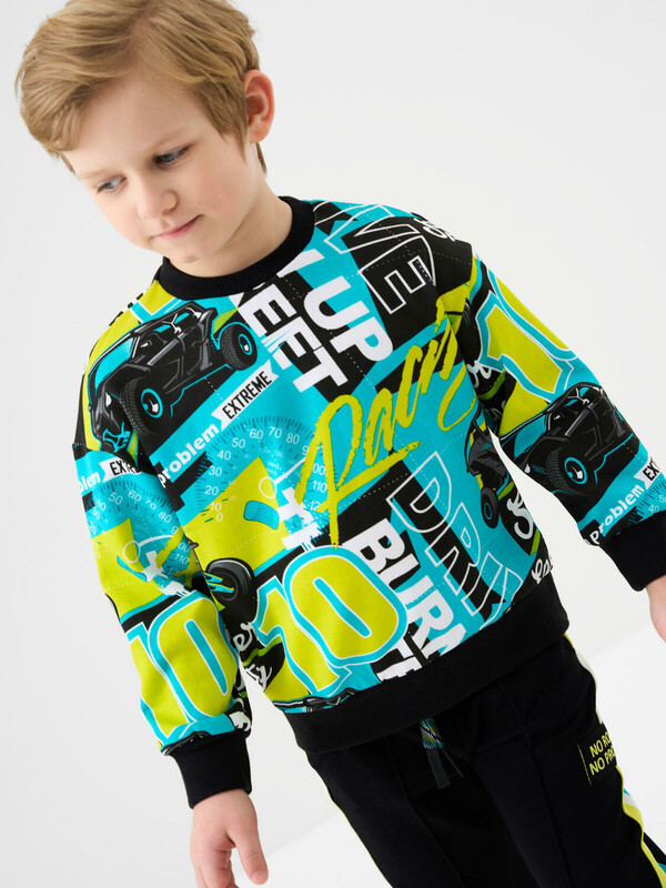Детский спортивный костюм для мальчика. Комплект выполнен из хлопкового футера и состоит из свитшота и брюк на резинке. Толстовка прямого кроя с красочным принтом. Манжеты и пояс выполнены из эластичного риба, благодаря чему изделие хорошо держит форму. Широкие брюки — комфортные, с эластичным поясом и шнуром для регулировки посадки. Удобные боковые карманы.