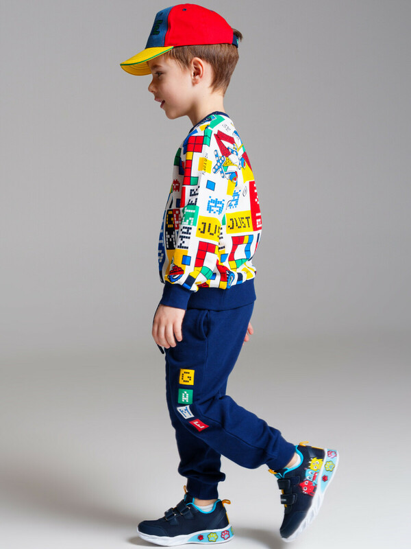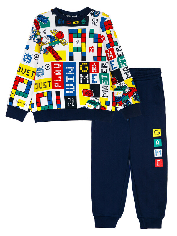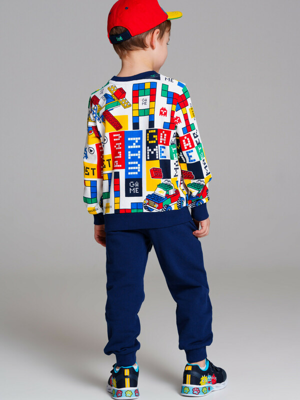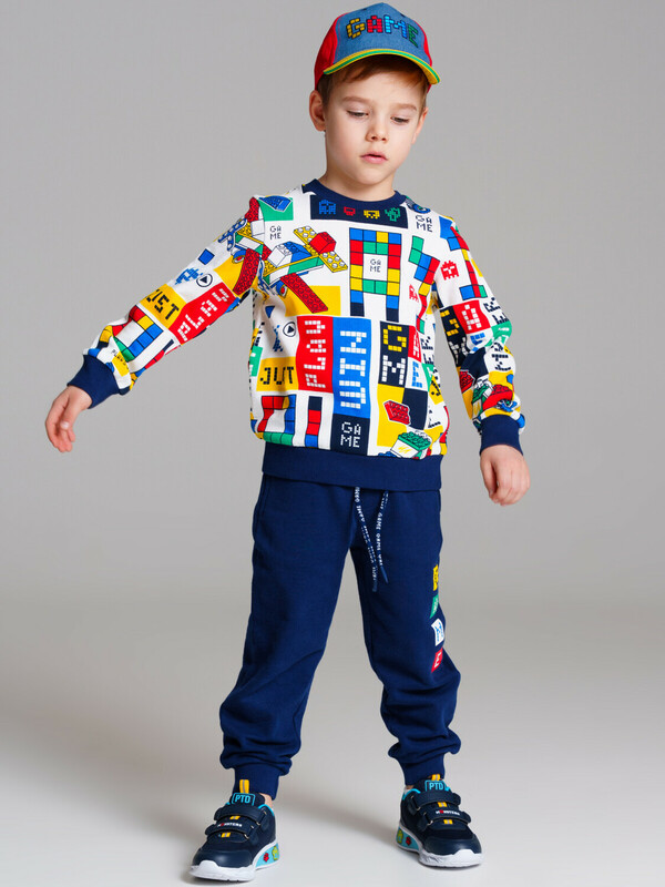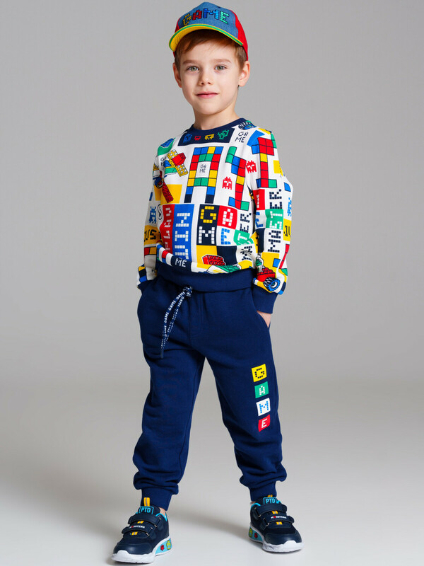 Комплект: свитшот и брюки. Выполнен из качественного футера. Свитшот regular fit. На манжетах и по низу изделия эластичный рубчик. Брюки с карманами в боковых швах. Эластичный пояс со шнурком. 100% хлопок.