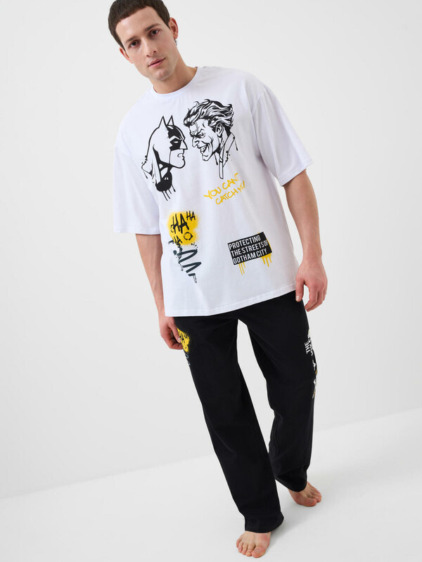 Мужская пижама. Комплект состоит из белой оверсайз футболки с коротким рукавом и чёрных брюк. На футболке изображены персонажи Бэтмен и Джокер в стиле граффити. Брюки на широкой резинке со шнурком для регулировки, с боковыми карманами. Материал - мягкий, хлопковый трикотаж. Можно составить family look c детским вариантом пижамы аналогичного дизайна.