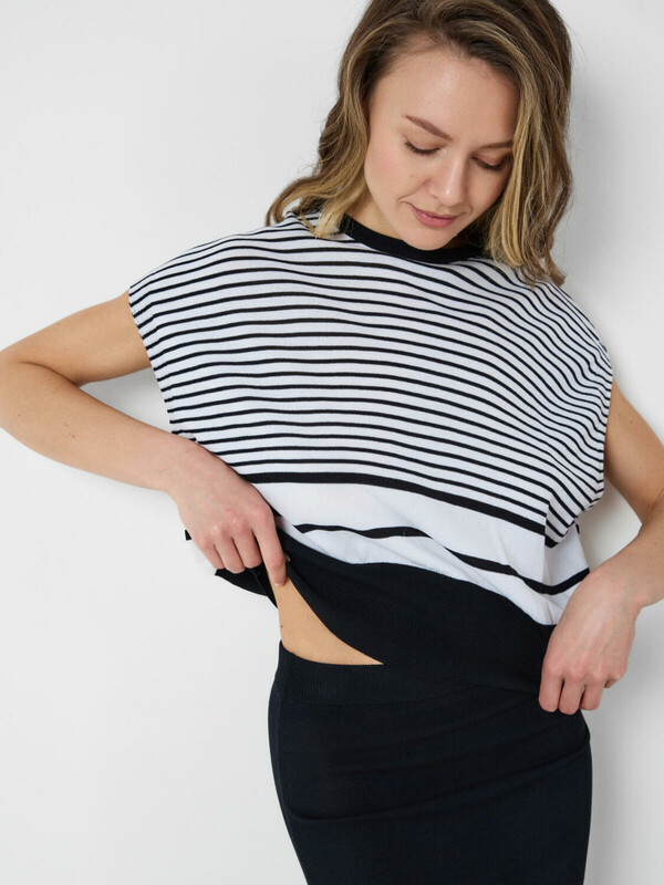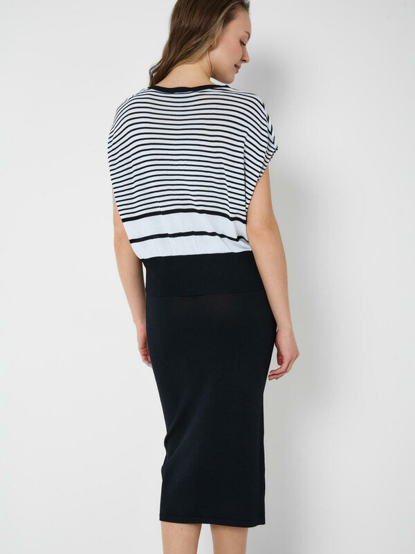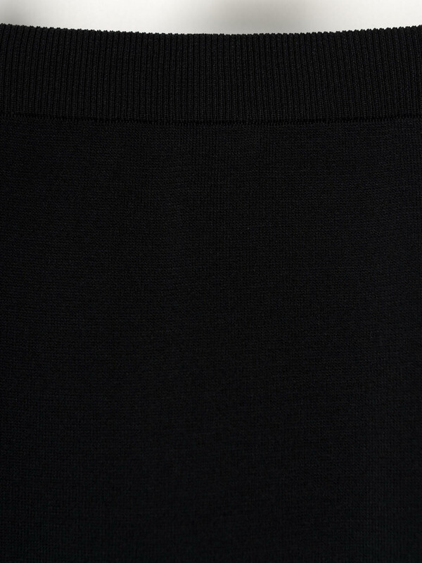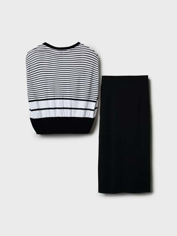 Женский комплект из вязаного трикотажа. Состоит из джемпера и прямой юбки. Джемпер свободный, с круглой горловиной. Юбка однотонная, в длине миди. Внизу джемпера — резинка для комфортной посадки. Материал — мягкий и эластичный вязаный трикотаж, приятный к телу.