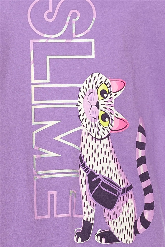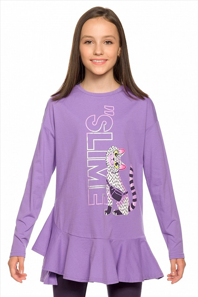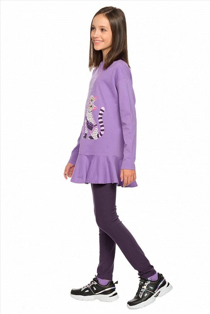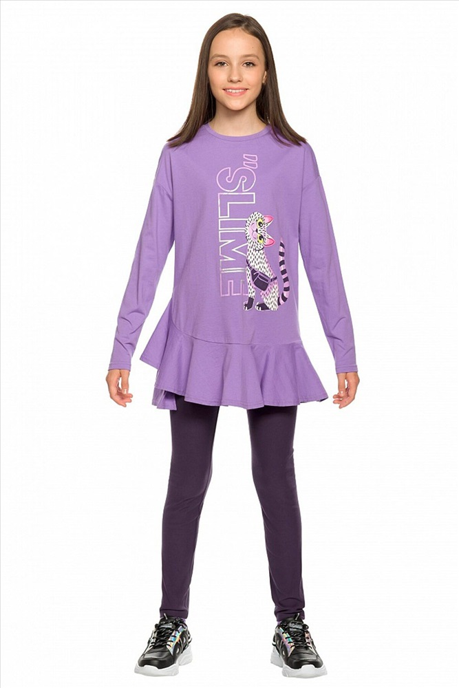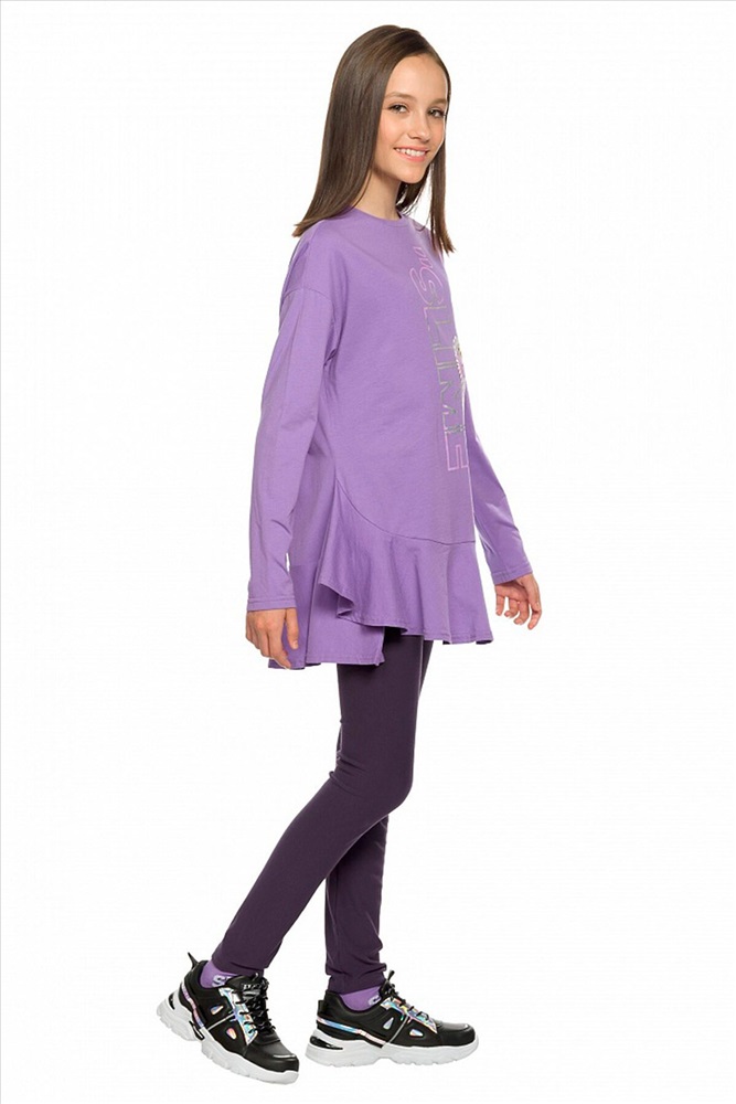 Комплект для девочек туника и лосины. Туника А силуэта с мягким спущенным плечом очень свободного силуэта. Асимметричный низ туники подчеркнут красивым воланом. Фольгированный голографический принт с неоном. Лосины из эластичного трикотажа.