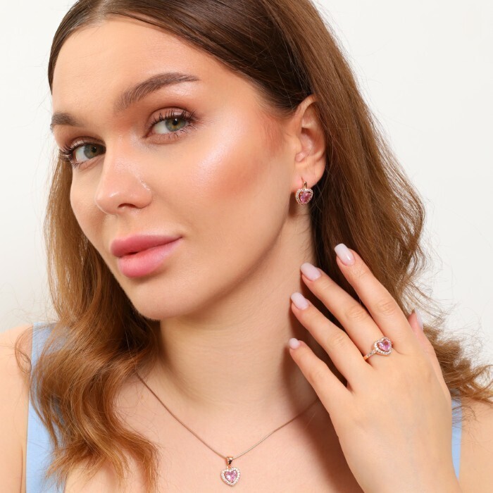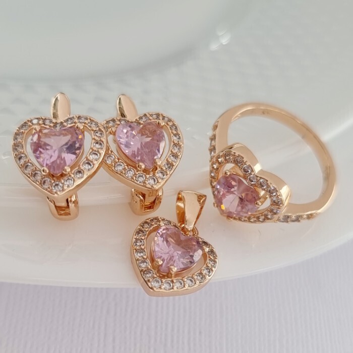 Комплект в форме сердца ювелирная бижутерия коллекция "Дубай" серьги, кулон и кольцо 18 р, покрытие: позолота, вставка: фианиты, цвет: прозрачный и розовый, арт.213.770-18