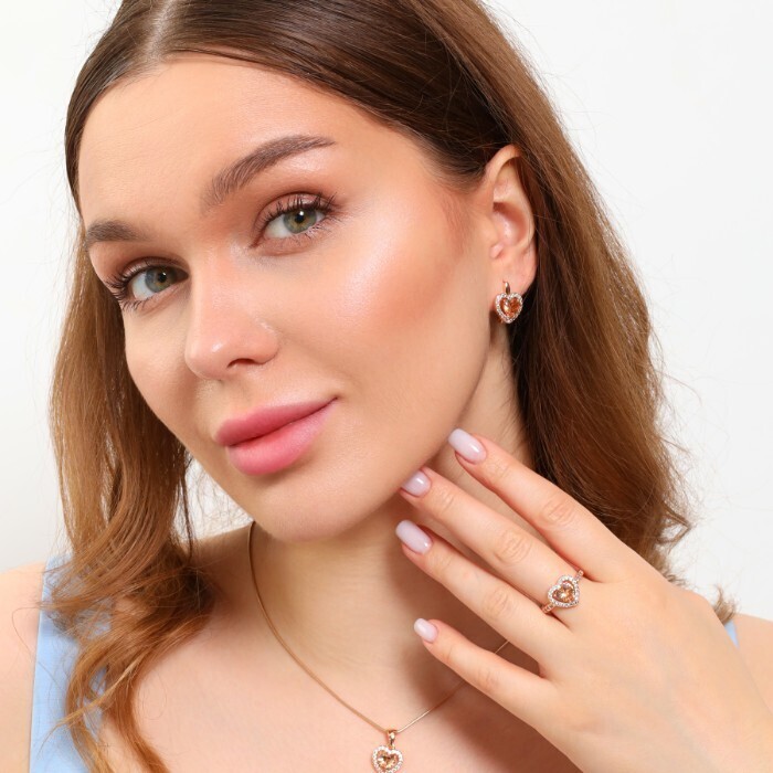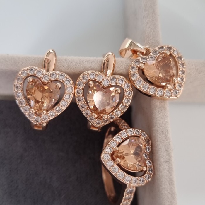 Комплект в форме сердца ювелирная бижутерия коллекция "Дубай" серьги, кулон и кольцо 18 р, покрытие: позолота, вставка: фианиты, цвет: прозрачный и песочный, арт.213.772-18