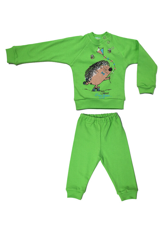 Комплект из комфортного пластичного трикотажа (интерлока).Горловина с обтачкой и застежкой на кнопки по пройме. Толстовка и брюки с манжетами по низу из отделочного полотна.Перед украшен принтом. Пояс брюк с резинкой