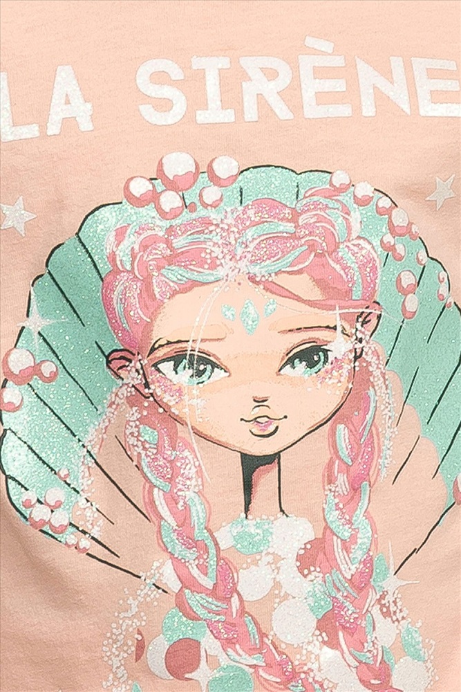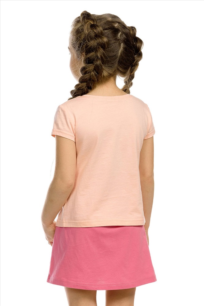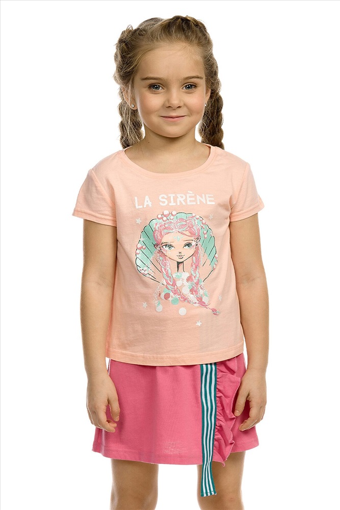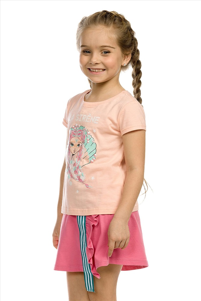 Комплект для девочек: футболка, юбка. Футболка умеренного объема, комфортной длины. Мягкий стойкий и эластичный принт с блестками. Юбка - новинка! Имитация запаха, по левой половине переда - рюша и вертикально настроченная полосатая репсовая лента шириной 4 см. Лента длиннее края изделия на 5 см. Мягкий пояс с широкой внутренней резинкой.