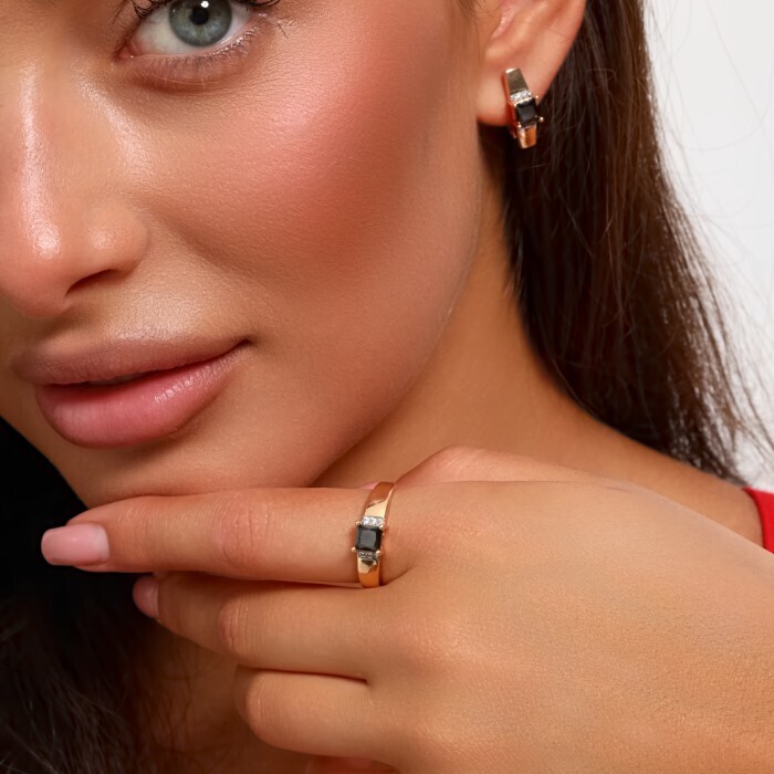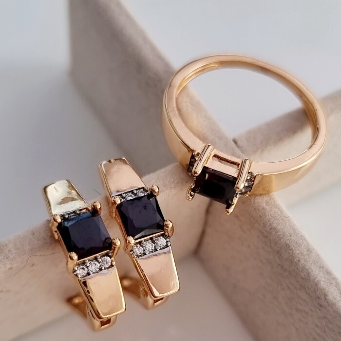 Комплект ювелирная бижутерия коллекция "Дубай" серьги и кольцо 17 р, покрытие: позолота, вставка: фианиты, цвет: черный и прозрачный, арт.217.296-17