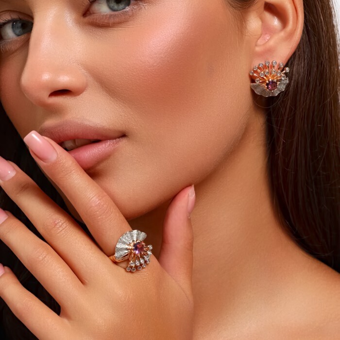 Комплект ювелирная бижутерия коллекция "Дубай" серьги и кольцо 17 р, покрытие: позолота, вставка: фианит, цвет: фиолетовый и прозрачный, арт.313.111-17