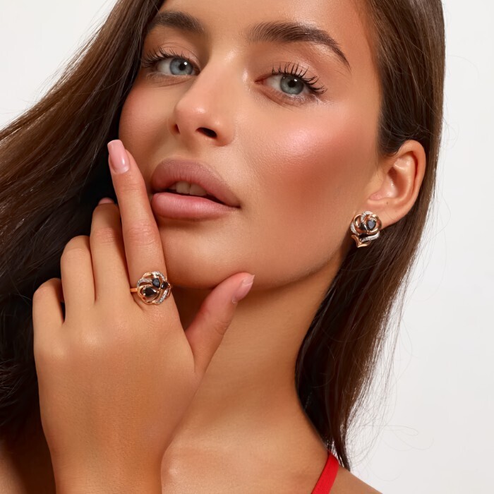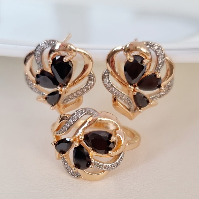 Комплект ювелирная бижутерия коллекция "Дубай" серьги и кольцо 18 р, покрытие: позолота, вставка: фианиты, цвет: черный, арт.217.287-18
