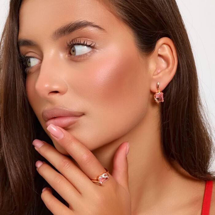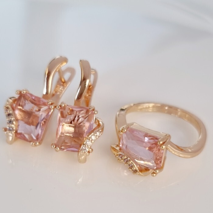 Комплект ювелирная бижутерия коллекция "Дубай" серьги и кольцо 18 р, покрытие: позолота, вставка: фианиты, цвет: розовый и прозрачный, арт.217.319-18
