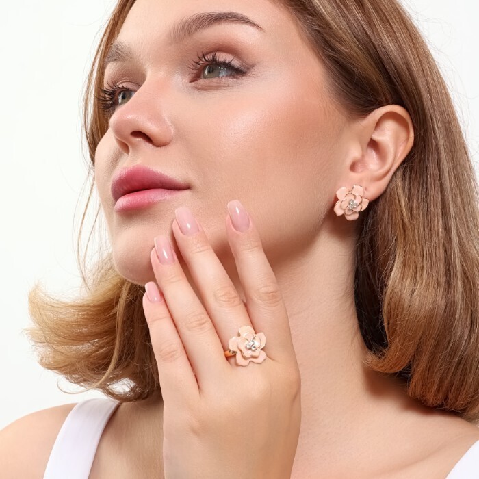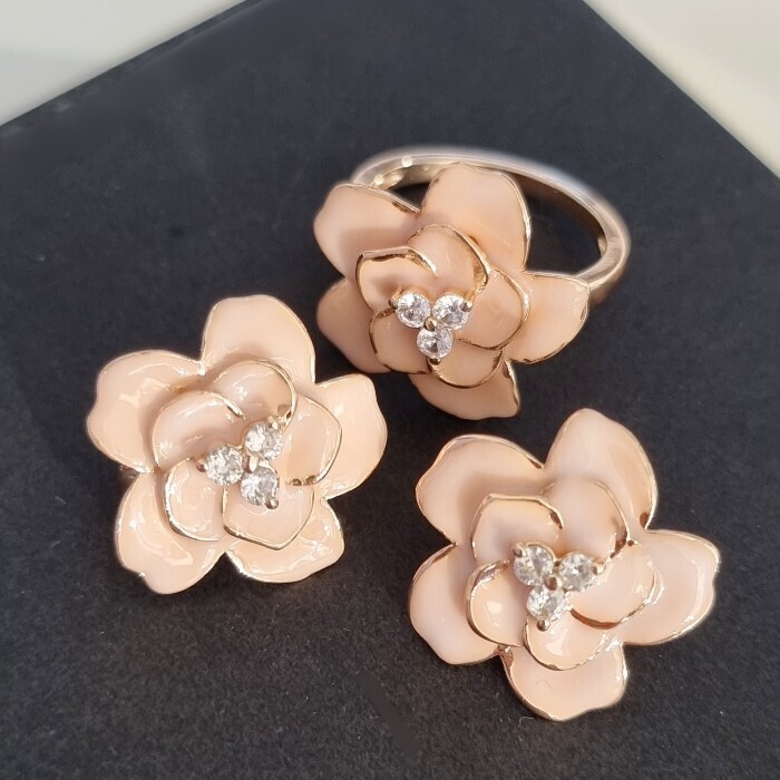 Комплект ювелирная бижутерия коллекция "Дубай" серьги и кольцо 18 р, покрытие: позолота, вставка: витражная эмаль бежевого цвета, арт.313.115-18