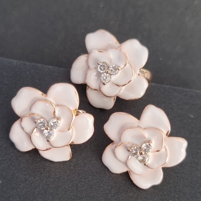 Комплект ювелирная бижутерия коллекция "Дубай" серьги и кольцо 18 р, покрытие: позолота, вставка: витражная эмаль белого цвета, арт.313.117-18