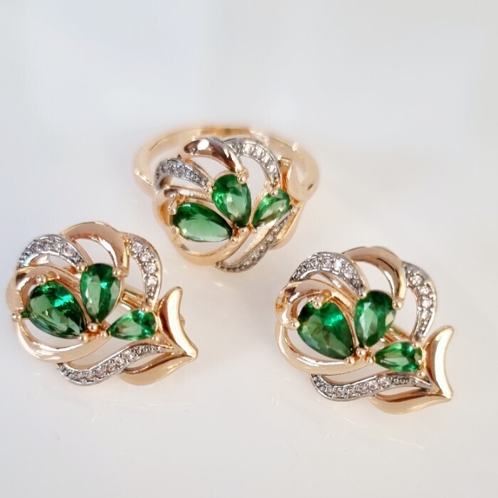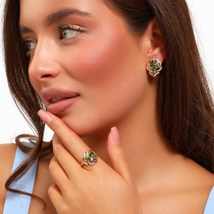 Комплект ювелирная бижутерия коллекция "Дубай" серьги и кольцо 19 р, покрытие: позолота, вставка: фианиты, цвет: зеленый арт.217.284-19