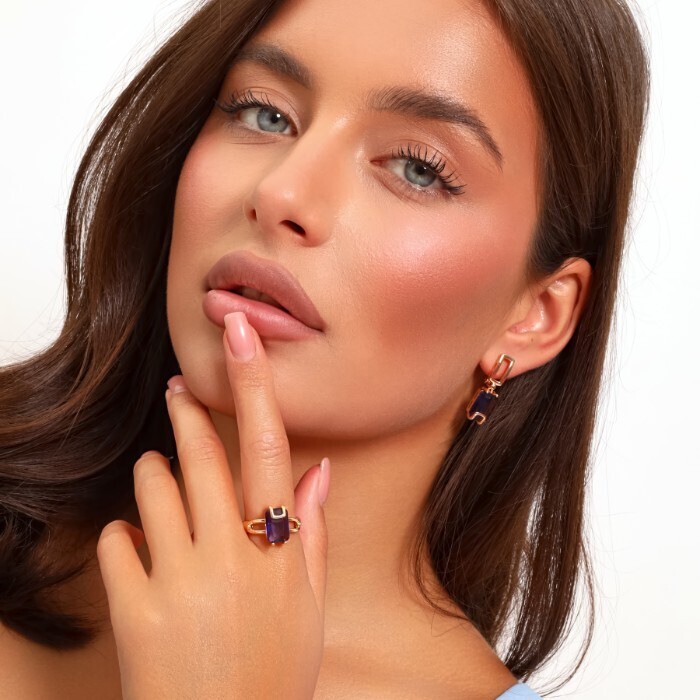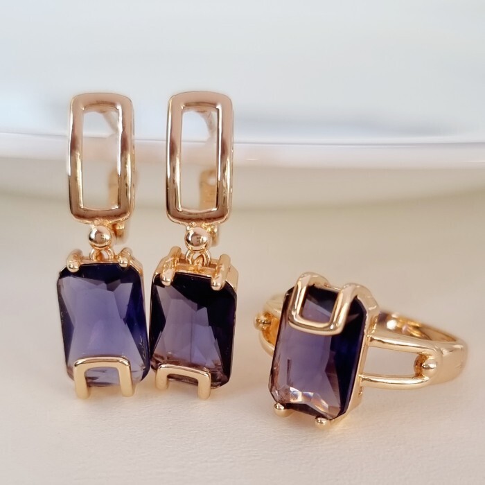 Комплект ювелирная бижутерия коллекция "Дубай" серьги и кольцо 19 р, покрытие: позолота, вставка: фианиты, цвет: фиолетовый, арт.217.306-18 (1)
