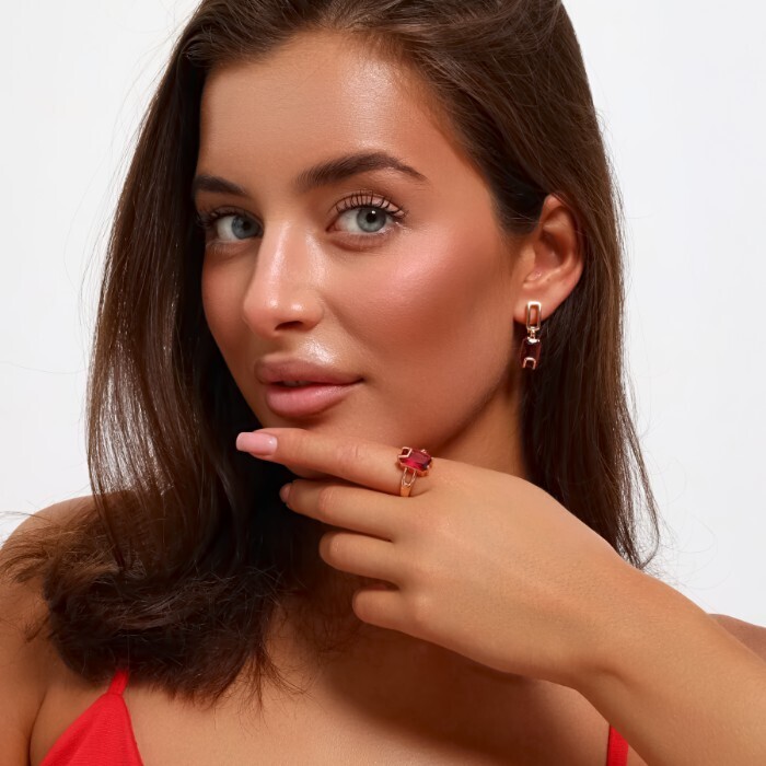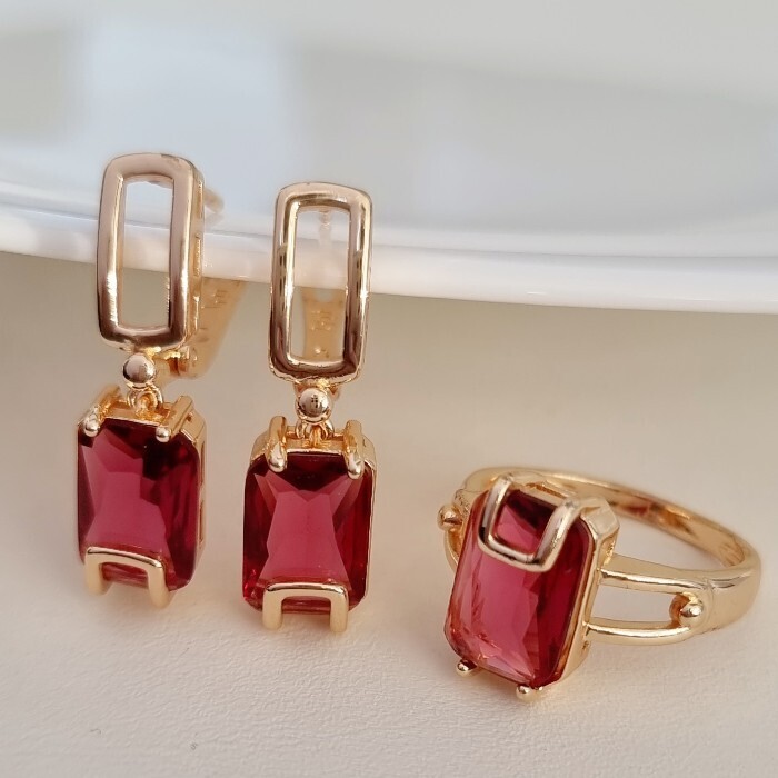 Комплект ювелирная бижутерия коллекция "Дубай" серьги и кольцо 19 р, покрытие: позолота, вставка: фианиты, цвет: малиновый, арт.217.308-19