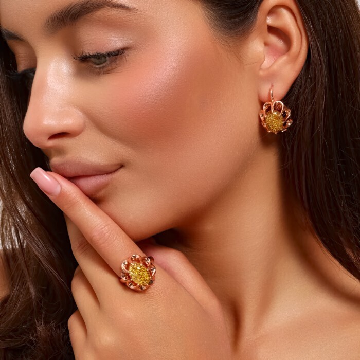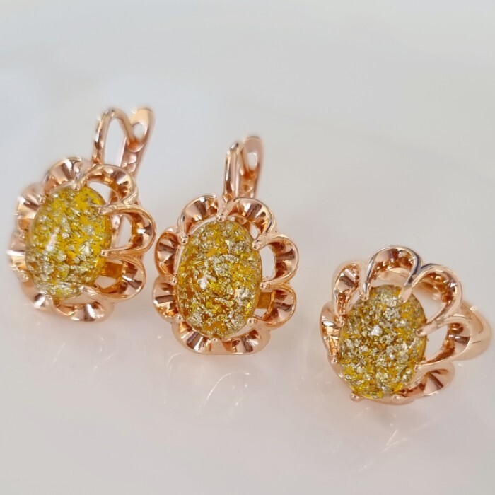 Комплект ювелирная бижутерия коллекция "Дубай" серьги и кольцо 20 р, покрытие: позолота, вставка: искусственный камень с вкраплениями, цвет: желтый, арт.313.126-20