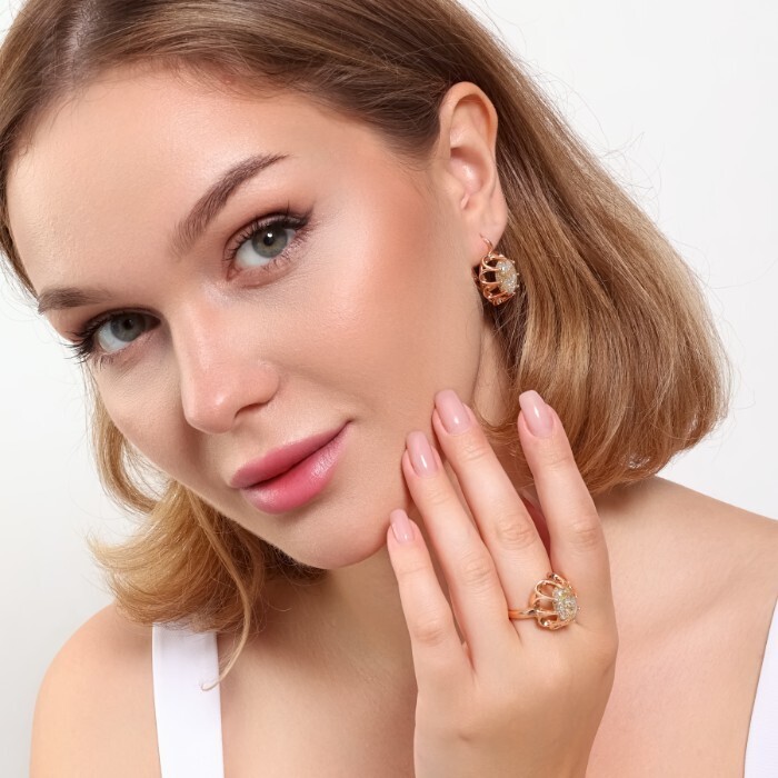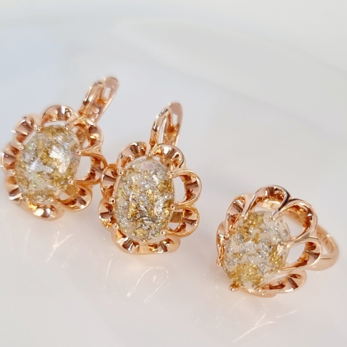 Комплект ювелирная бижутерия коллекция "Дубай" серьги и кольцо 20 р, покрытие: позолота, вставка: искусственный камень с вкраплениями, цвет: бежевый, арт.313.129-20