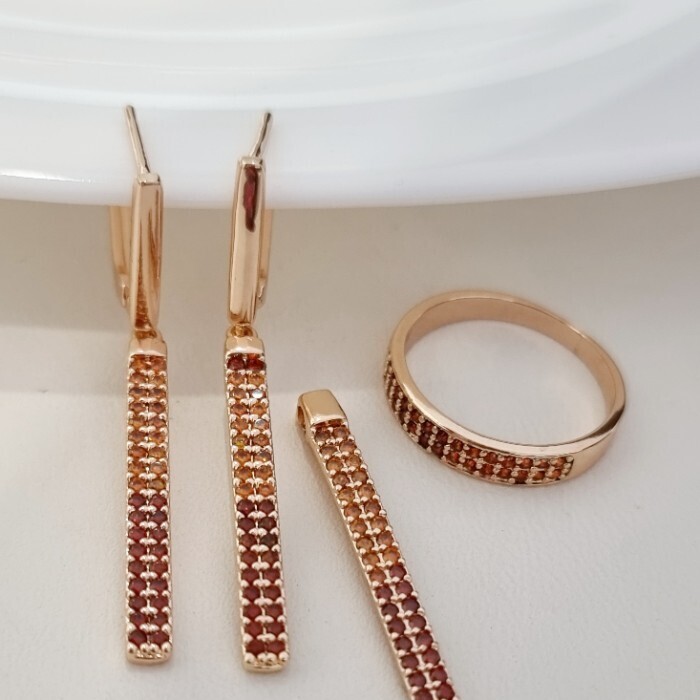 Комплект ювелирная бижутерия коллекция "Дубай" серьги, кулон и кольцо 16 р, покрытие: позолота, вставка: фианиты, цвет: оранжевый, арт.215.413-16