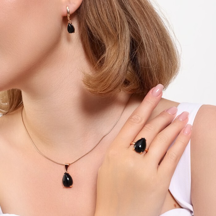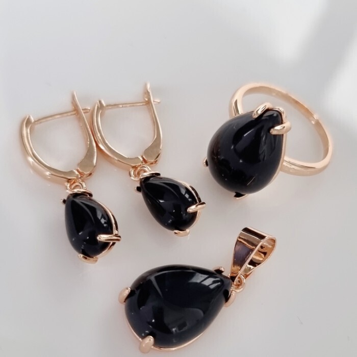 Комплект ювелирная бижутерия коллекция "Дубай" серьги, кулон и кольцо 17 р, покрытие: позолота, вставка: пластик, цвет: черный, арт.215.417-17