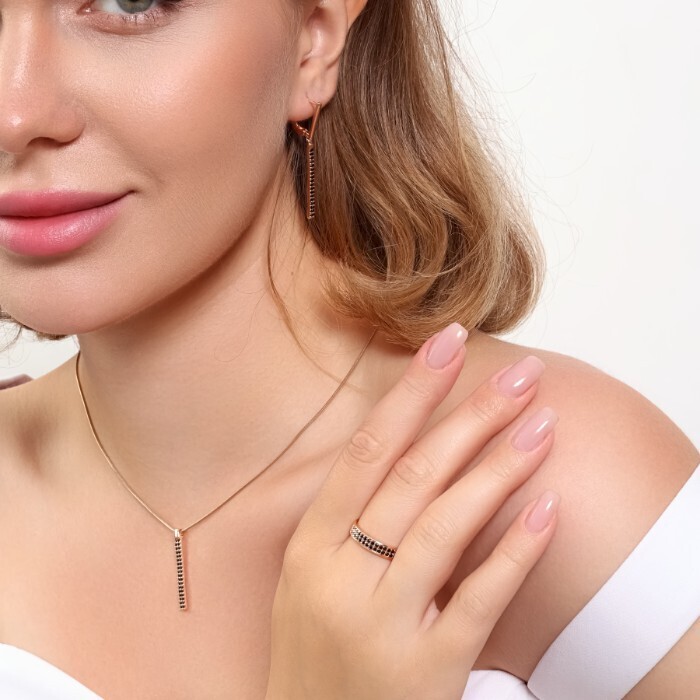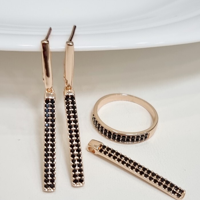Комплект ювелирная бижутерия коллекция "Дубай" серьги, кулон и кольцо 19 р, покрытие: позолота, вставка: фианиты, цвет: черный, арт.215.410-19