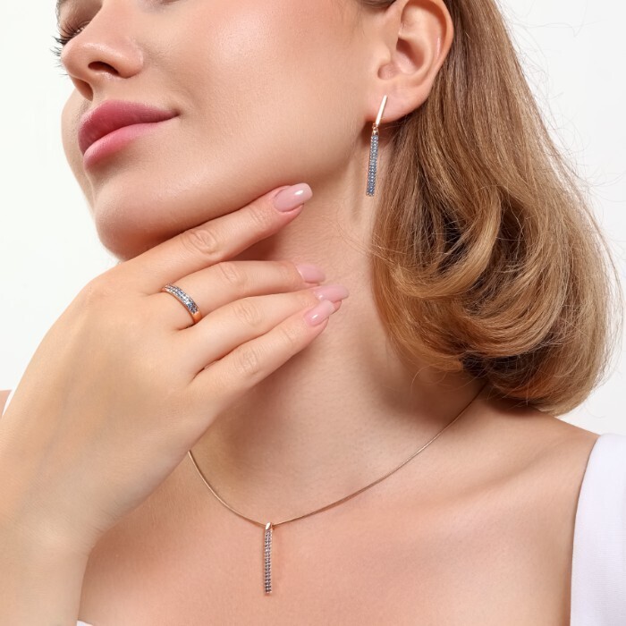 Размер серьги: 4,5*0,4 см. Замок: английский. Размер кулона: 3*0,4 см. Вес комплекта: 7 гр. Внимание! Цепочка в комплект не входит.