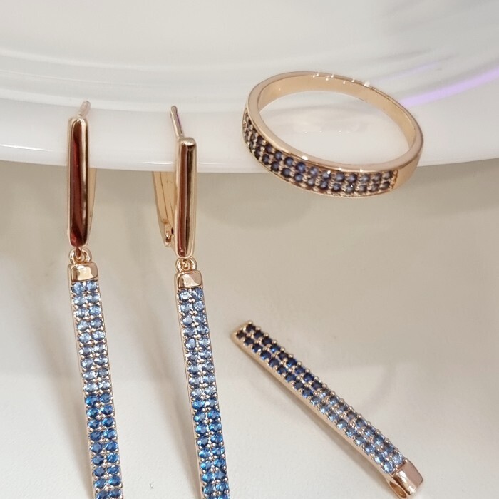 Комплект ювелирная бижутерия коллекция "Дубай" серьги, кулон и кольцо 19 р, покрытие: позолота, вставка: фианиты, цвет: синий, арт.215.412-19