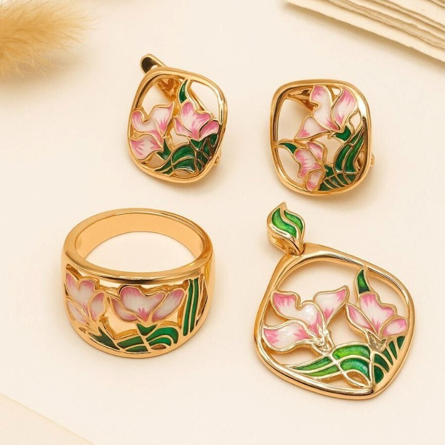 Комплект ювелирная бижутерия коллекция "Дубай" серьги, кулон и кольцо 19 р, покрытие: позолота, вставка: цветная эмаль и цирконы, арт.313.272-19