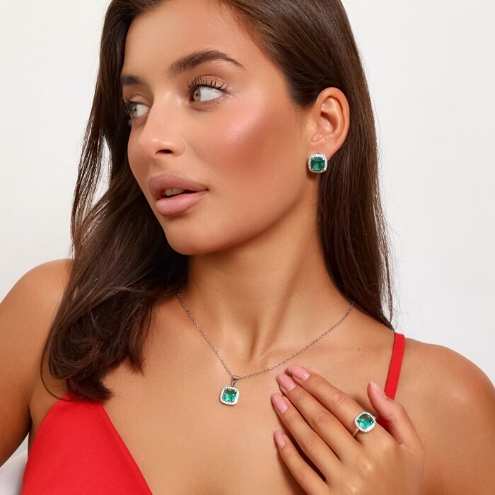 Комплект ювелирная бижутерия серьги, кулон и кольцо 17 р, покрытие: посеребрение, вставка: фианит, цвет: морска волна и прозрачный, арт.313.104-17
