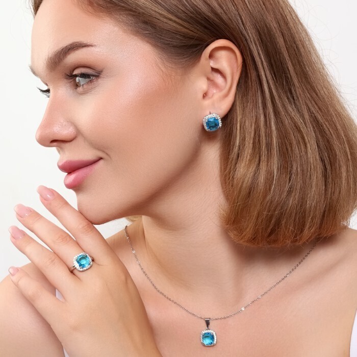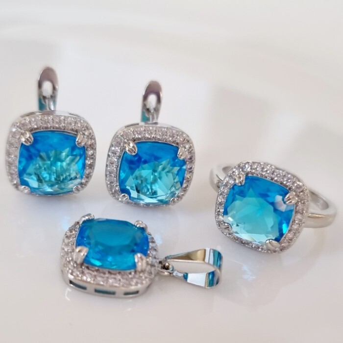 Комплект ювелирная бижутерия серьги, кулон и кольцо 17 р, покрытие: посеребрение, вставка: фианит, цвет: голубой и прозрачный, арт.313.103-17