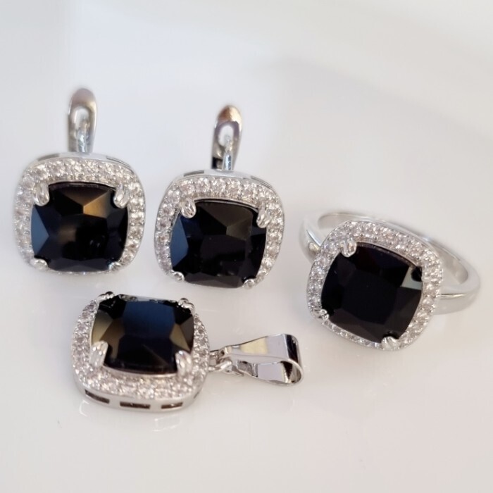 Комплект ювелирная бижутерия серьги, кулон и кольцо 18 р, покрытие: посеребрение, вставка: фианит, цвет: черный и прозрачный, арт.313.105-18