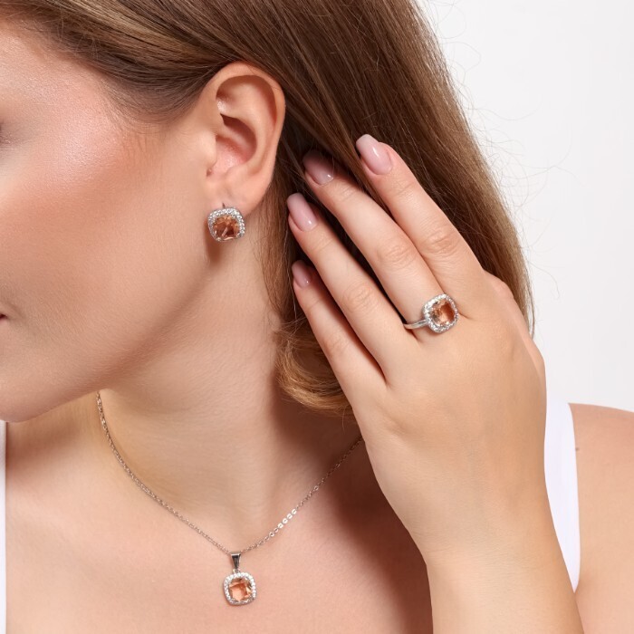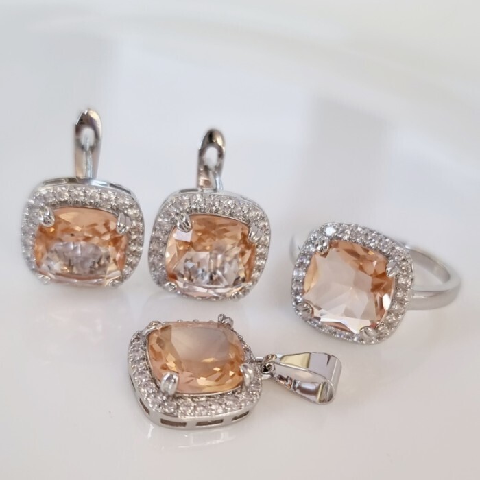 Комплект ювелирная бижутерия серьги, кулон и кольцо 18 р, покрытие: посеребрение, вставка: фианит, цвет: бежевый и прозрачный, арт.313.109-18