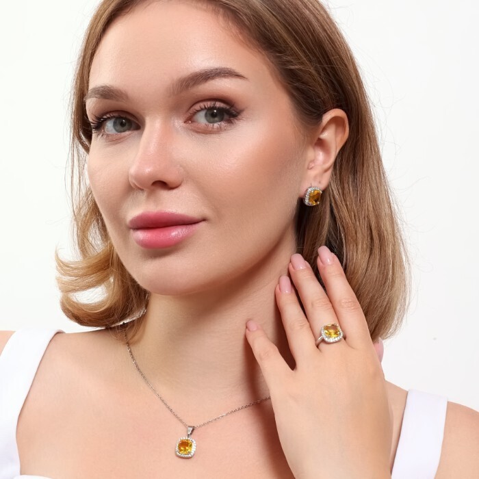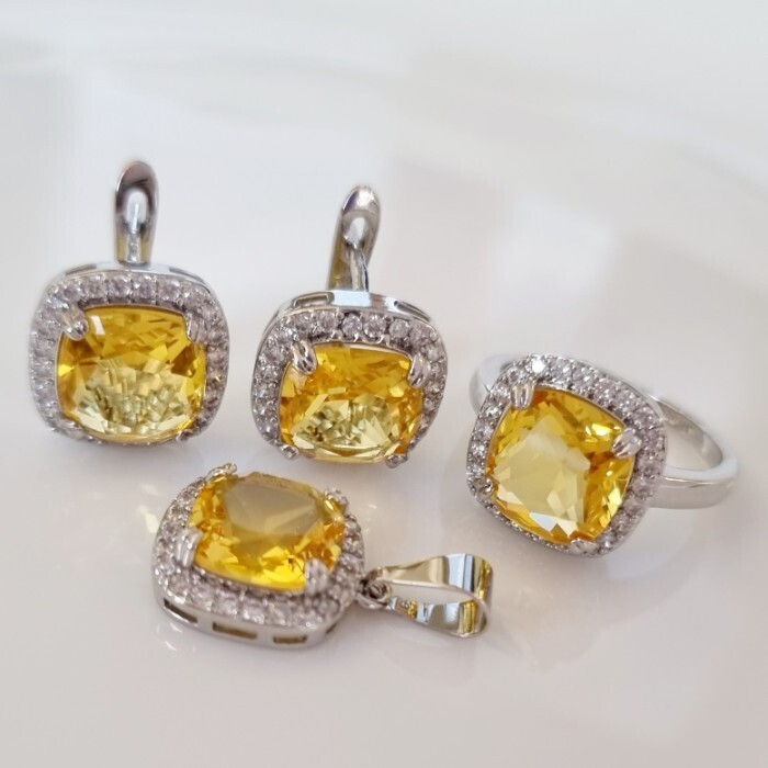 Комплект ювелирная бижутерия серьги, кулон и кольцо 18 р, покрытие: посеребрение, вставка: фианит, цвет: желтый и прозрачный, арт.313.108-18