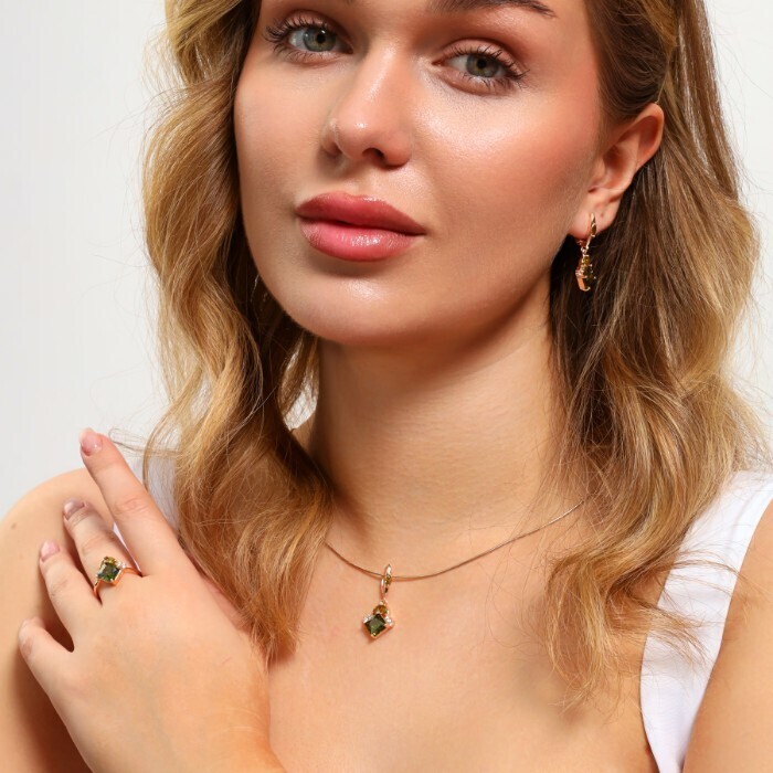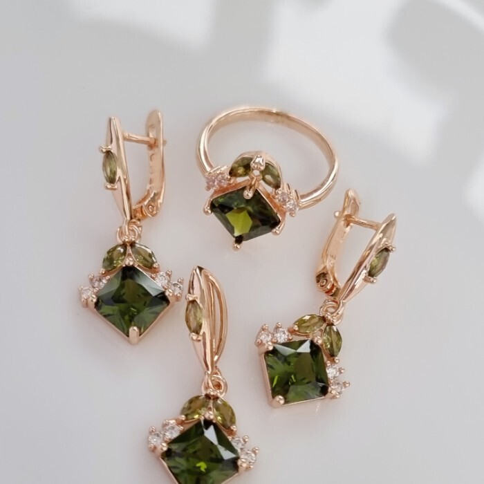 Комплект ювелирной бижутерии Дубайское золото, покрытие: позолота, серьги, кулон и кольцо 18 р, вставка: фианиты, цвет: зеленый и прозрачный, арт.314.779-18