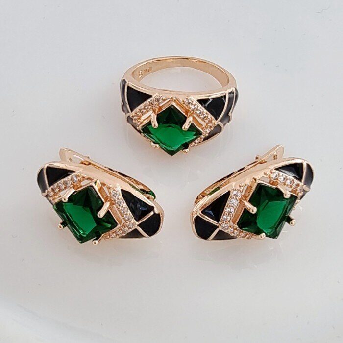 Комплект ювелирной бижутерии Дубайское золото серьги и кольцо, покрытие позолота, вставка: эмаль и фианиты, цвет: черный и зеленый, р-р 20, арт.314.460-20