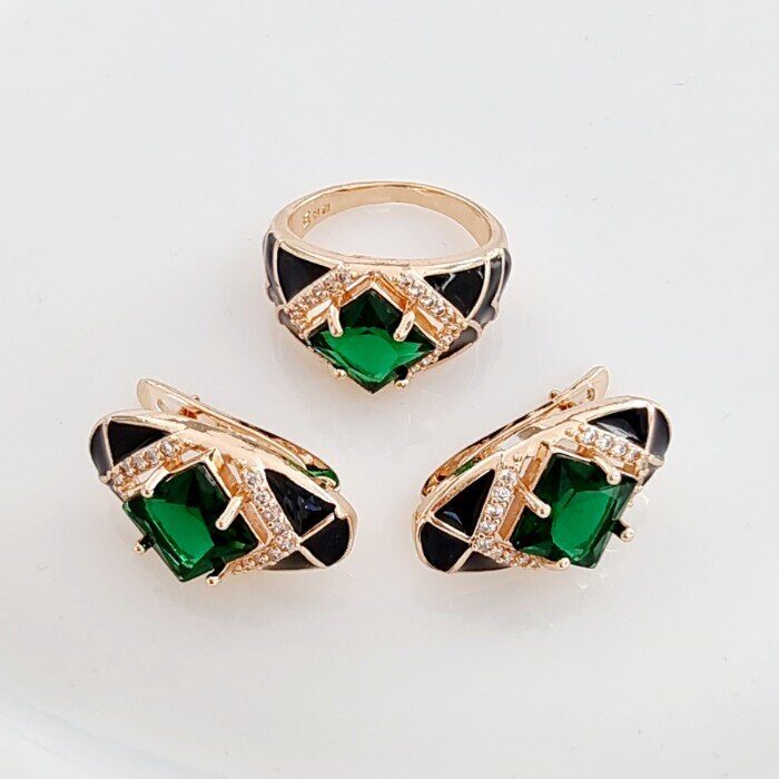 Комплект ювелирной бижутерии Дубайское золото серьги и кольцо, покрытие позолота, вставка: эмаль и фианиты, цвет: черный и зеленый, р-р 19, арт.314.460-19