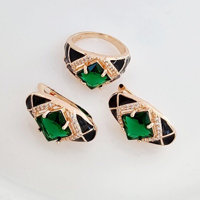 Комплект ювелирной бижутерии Дубайское золото серьги и кольцо, покрытие позолота, вставка: эмаль и фианиты, цвет: черный и зеленый, р-р 18, арт.314.460-18