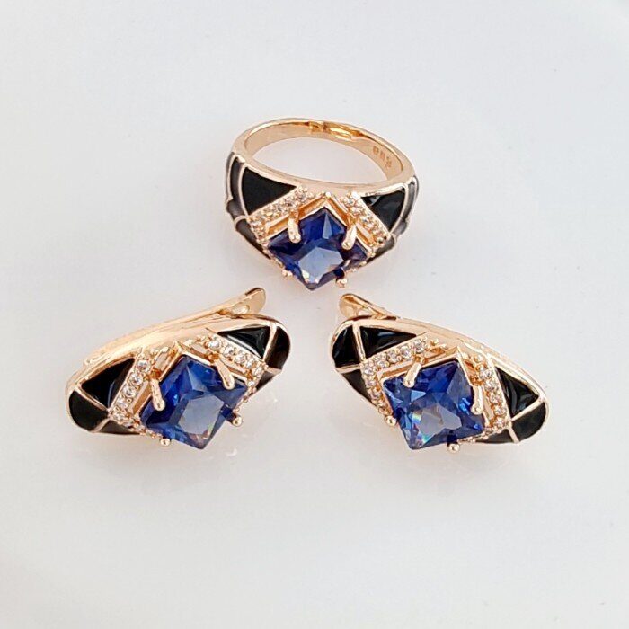 Комплект ювелирной бижутерии Дубайское золото серьги и кольцо, покрытие позолота, вставка: эмаль и фианиты, цвет: черный и синий, р-р 20, арт.314.458-20