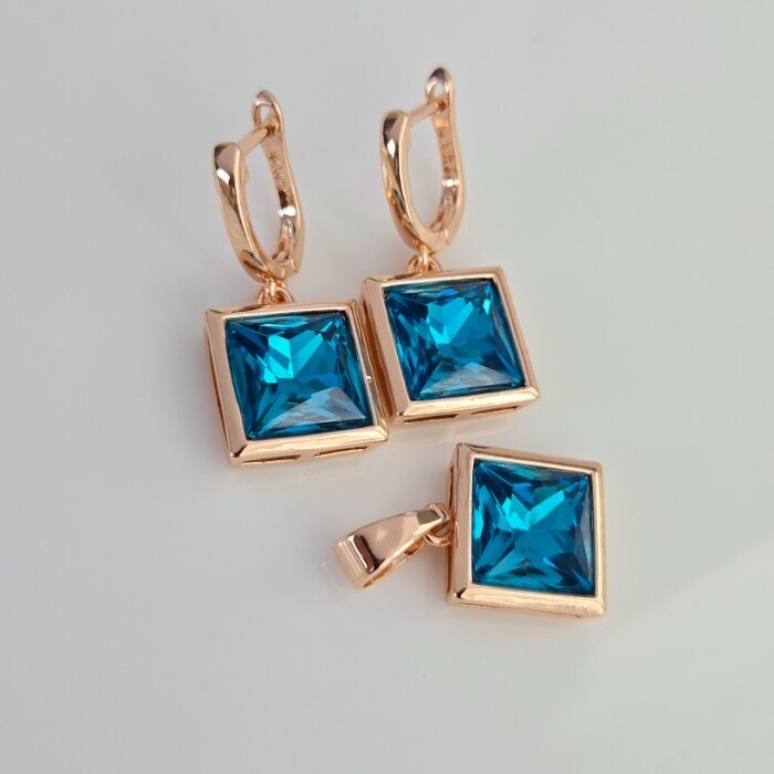 Комплект ювелирной бижутерии Дубайское золото: серьги и кулон с крупным камнем, покрытие позолота, вставка: фианит, цвет: голубой, арт.314.992