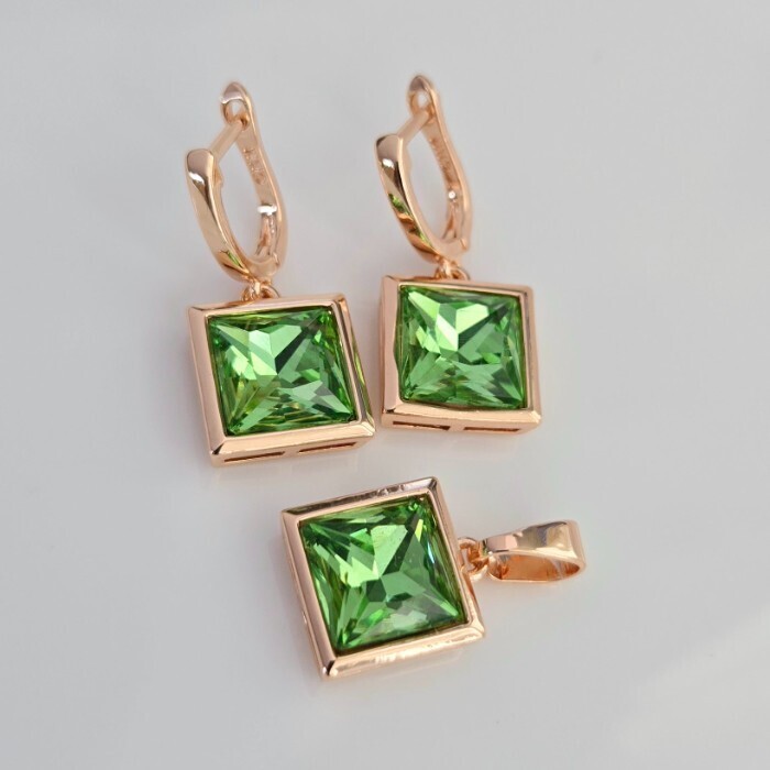 Комплект ювелирной бижутерии Дубайское золото: серьги и кулон с крупным камнем, покрытие позолота, вставка: фианит, цвет: зеленый, арт.314.993