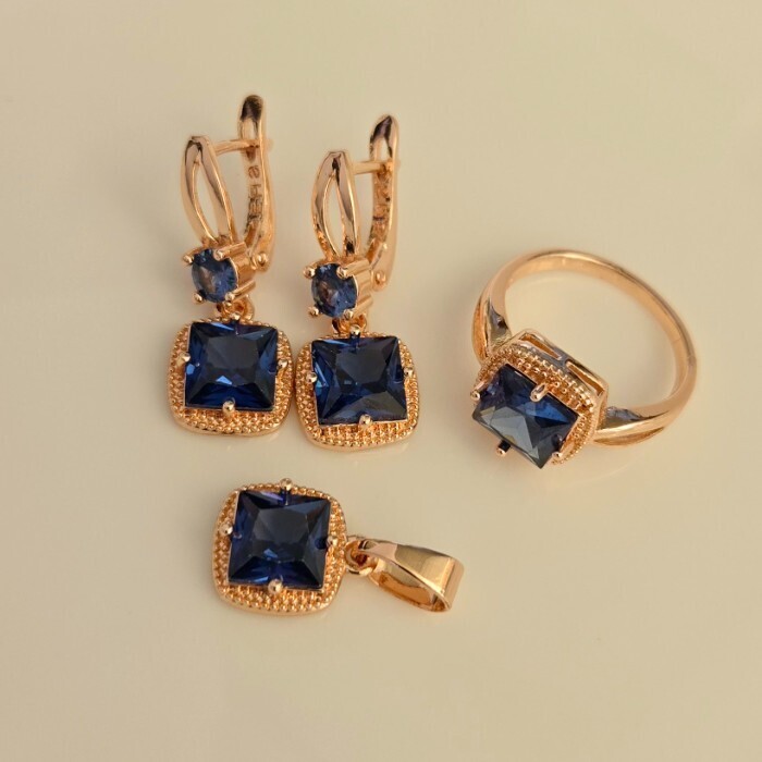 Комплект ювелирной бижутерии Дубайское золото: серьги, кулон и кольцо 18 р с крупным камнем, покрытие позолота, вставка: фианит, цвет: синий, арт.314.962-18