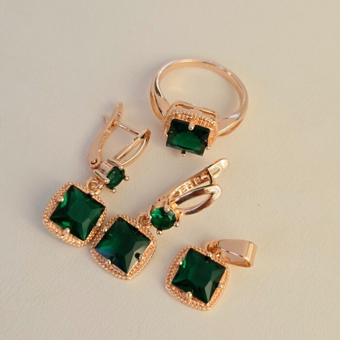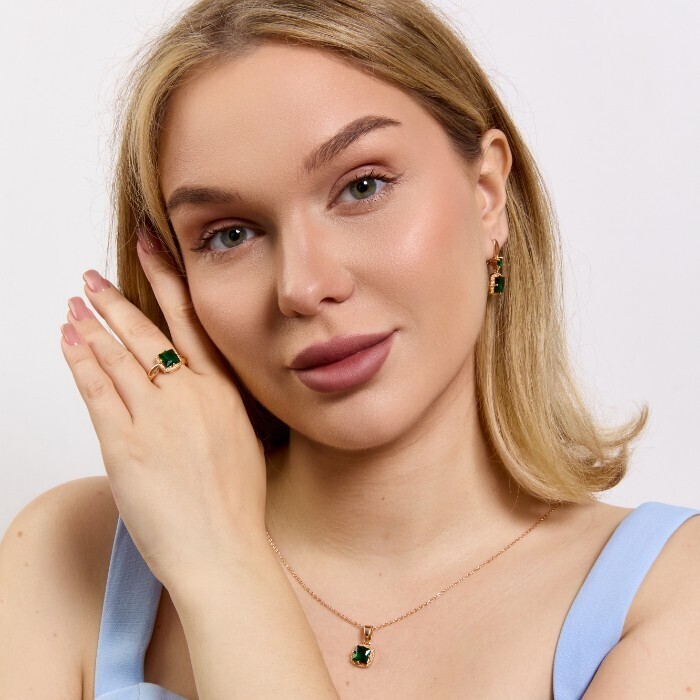 Комплект ювелирной бижутерии Дубайское золото: серьги, кулон и кольцо 18 р с крупным камнем, покрытие позолота, вставка: фианит, цвет: изумрудный зеленый, арт.314.961-18