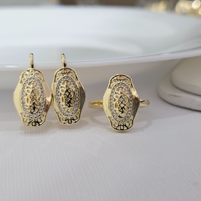 Комплект ювелирной бижутерии Итальянское золото (покрытие желтое 14к), серьги и кольцо 19 р, вставка: фианиты, цвет: прозрачный, арт.313.308-19