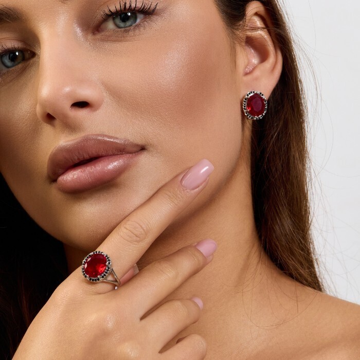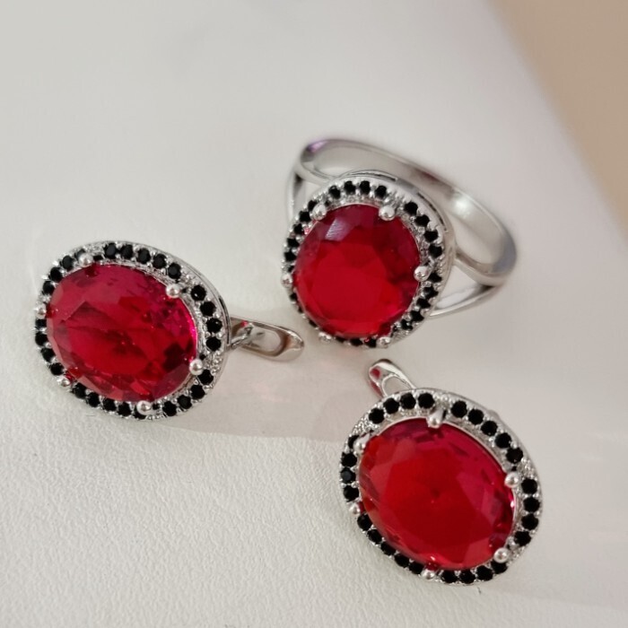 Комплект ювелирной бижутерии коллекция "Дубай" серьги и кольцо 17 р покрытие посеребрение, вставка: стекло и цирконы, цвет: красный и черный, арт.215.609-17