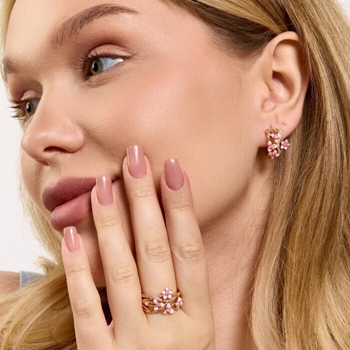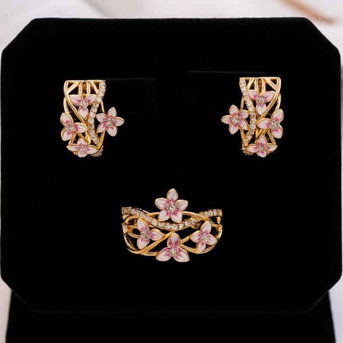 Комплект ювелирной бижутерии коллекция "Дубай" серьги и кольцо 17 р, покрытие позолота, вставка: эмаль и цирконы, цвет: белый, розовый и прозрачный, арт.313.324-17