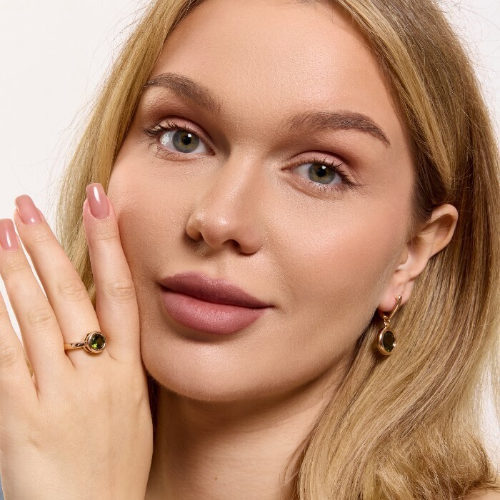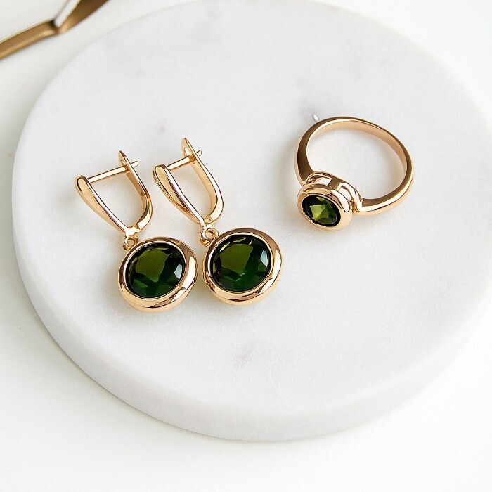 Комплект ювелирной бижутерии коллекция "Дубай" серьги и кольцо 17 р, покрытие позолота, вставка: фианит, цвет: темно-оливковый, арт.313.337-17