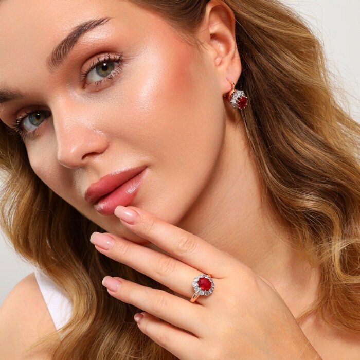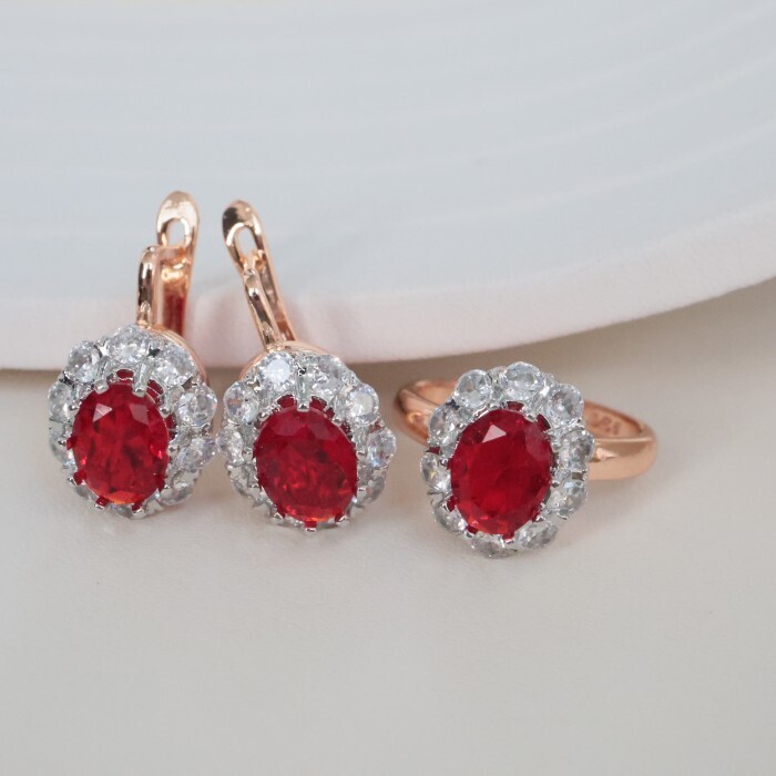 Комплект ювелирной бижутерии коллекция "Дубай" серьги и кольцо 17 р, покрытие позолота, вставка: фианиты, цвет: прозрачный и красный, арт.213.966-17