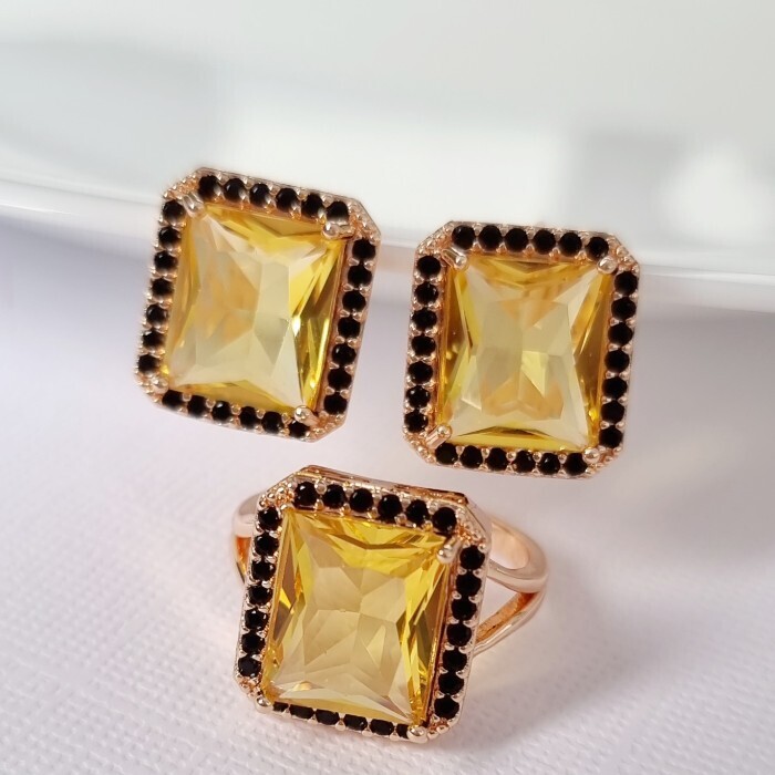 Комплект ювелирной бижутерии коллекция "Дубай" серьги и кольцо 17 р, покрытие позолота, вставка: фианиты, цвет: желтый и черный, арт.215.361-17